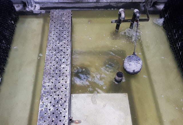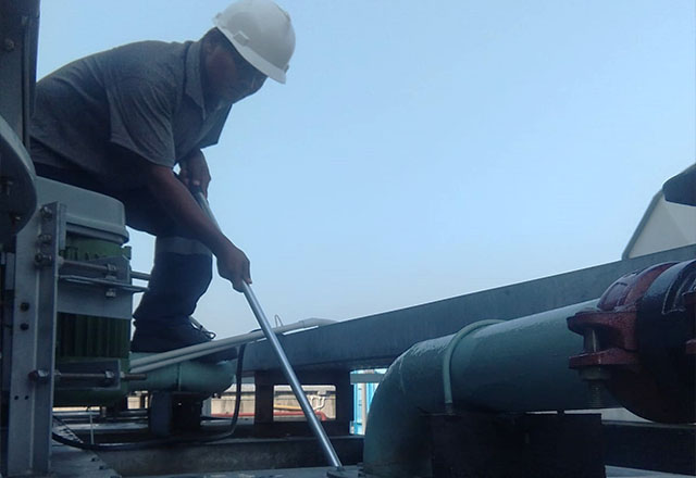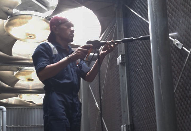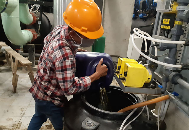 Selain melakukan pengecekan kualitas air secara rutin (harian dan bulanan), kami juga menjaga kebershian pada cooling tower, juga melakukan pembersihan filter secara berkan, dan area cooling tower.